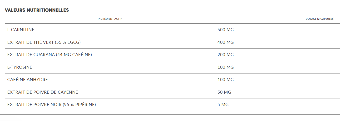 Ingrédients : L-Carnitine, extrait de thé vert (55 % EGCG), extrait de guarana, caféine anhydre, L-tyrosine, extrait de poivre de Cayenne, extrait de poivre noir (95 % pipérine), cellulose microcristalline, gélatine bovine.